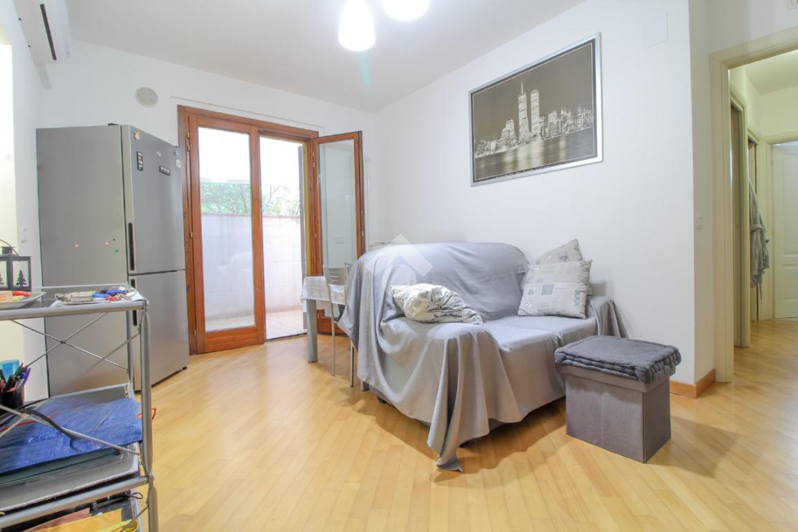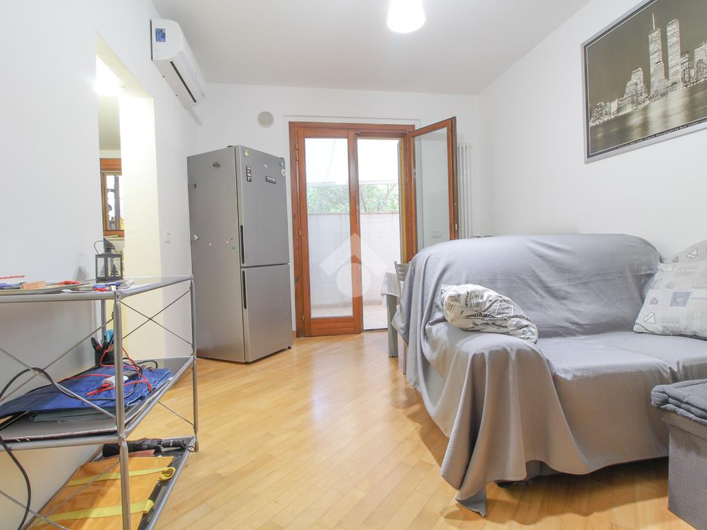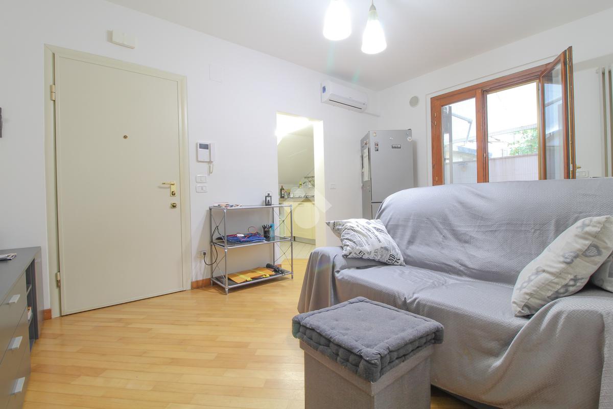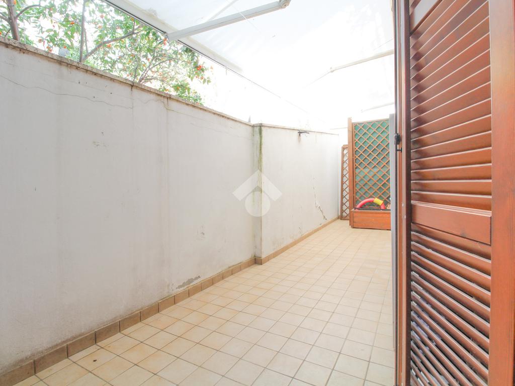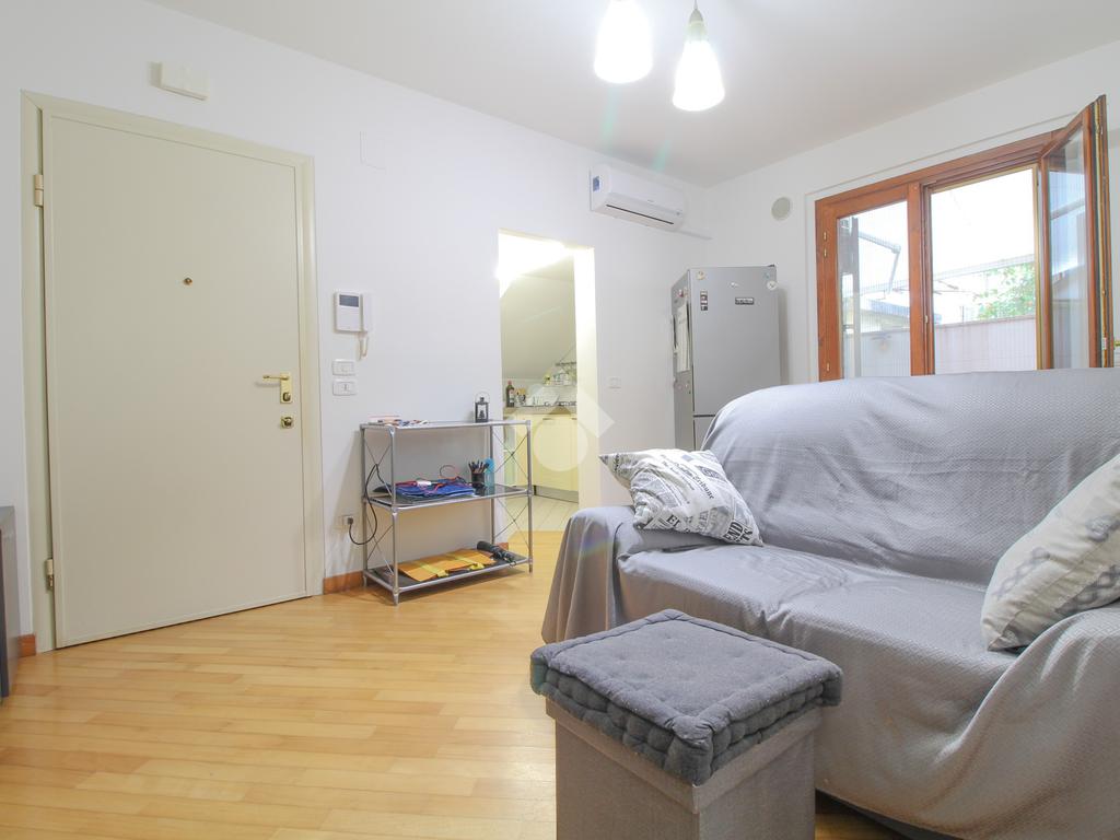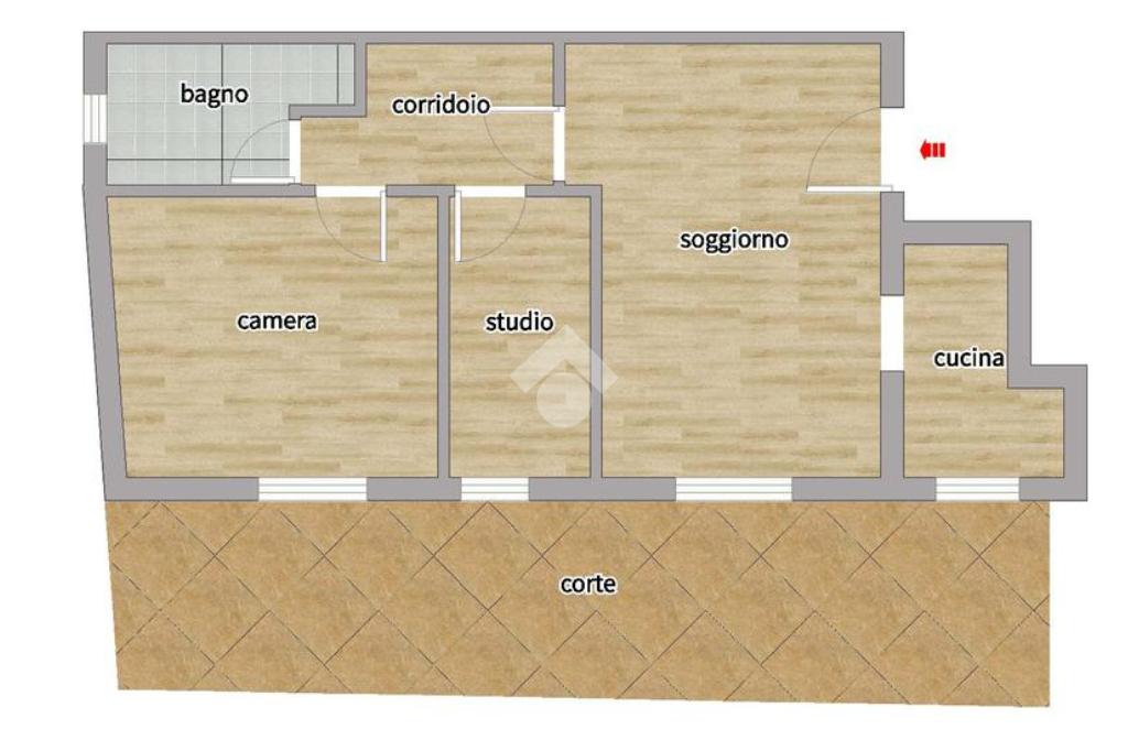 Al piano terra disponiamo di grazioso trilocale composto di: ingresso, soggiorno, cucinotto, camera matrimoniale, studio/cameretta, bagno con finestra e corte pavimentata di 20 mq ca. L'appartamento internamente si presenta in ottimo stato, con pavimentazione in parquet, infissi in legno con doppio vetro, portone blindato di ingresso, impiantistica a norma, climatizzazione, rivestimenti del bagno in ceramica; complessivamente l'appartamento è una soluzione abitativa funzionale e accogliente, pronta per essere abitata senza necessità di interventi se non una ordinaria ritinteggiata delle mura.